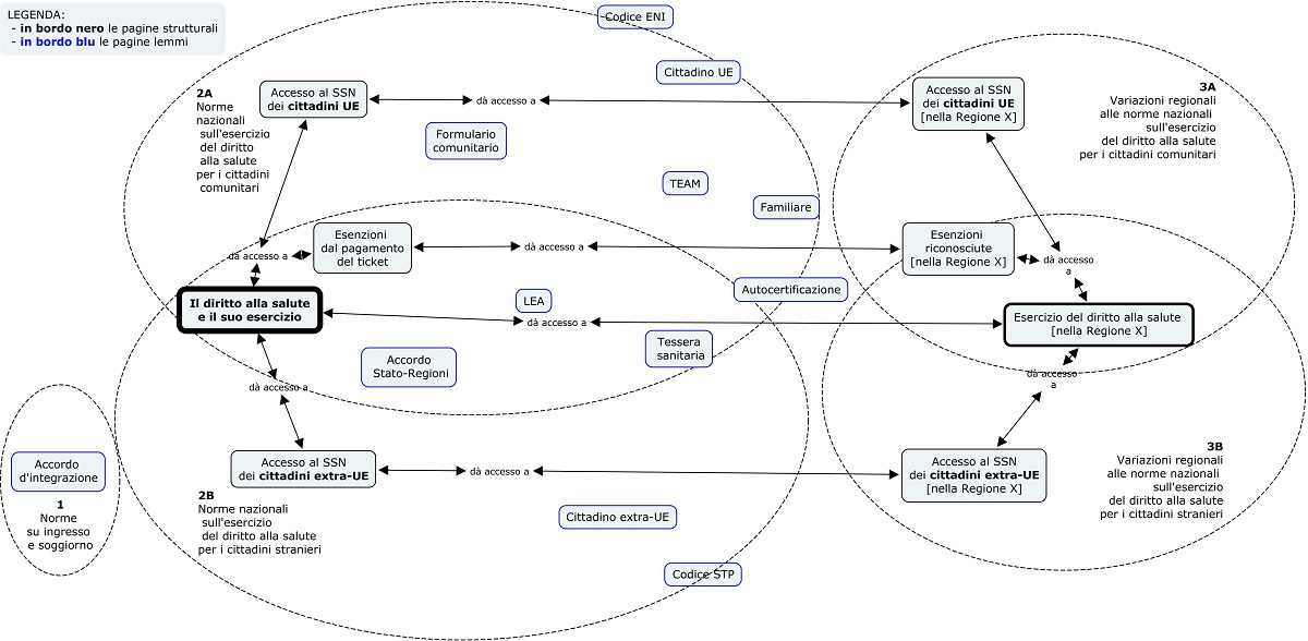 - le frecce rappresentano i collegamenti tra le pagine, quindi i percorsi possibili di navigazione dell’ipertesto a partire dalla pagina di riferimento, “Il diritto alla salute e il suo esercizio”.