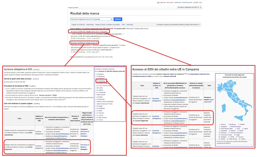 Accanto alla navigazione via link, un’ulteriore modalità di navigazione è costituita dalla possibilità di effettuare una ricerca per parole chiave, usando il motore di ricerca interno riportato in alto a destra nella pagina. In figura 6 è possibile vedere come, scrivendo alcune parole chiave come “lavoratore stagionale extra-UE Campania”, si arrivi direttamente alla pagina riportante le informazioni relative al quel caso nella Regione richiesta.